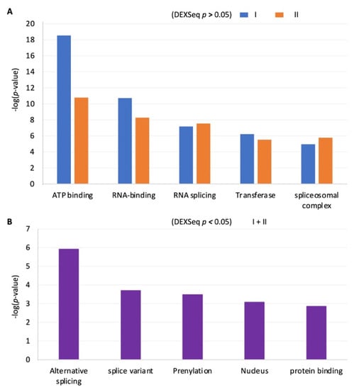 Significantly enriched functional clusters of the genes identified with RISE. Bar graphs of the –LOG (p-value) of the DAVID functional clustering analysis for genes with type I or II RISE pairing of adjacent exons without significant changes by depolarization ((A), p < 0.05 by DEXSeq, n = 663 and 456 gene IDs for type I and II, respectively) and those with adjacent exons changed significantly by depolarization ((B), p < 0.05 by DEXSeq, n = 34 gene IDs).