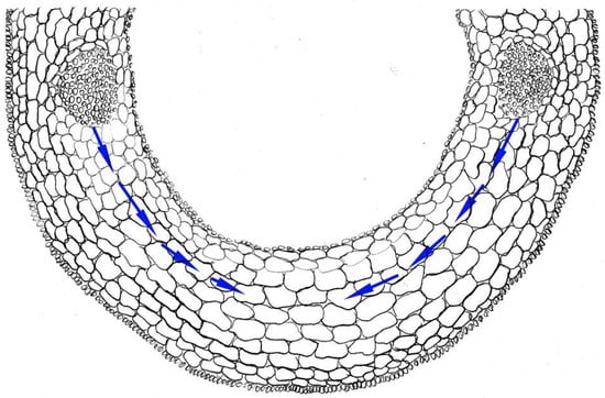 Scheme of cross-section of rice coleoptile. Arrows indicate the water pathway from vascular bundles to elongating cells. This figure was drawn by Dr. G. Sharipova on the basis of microscope observation.