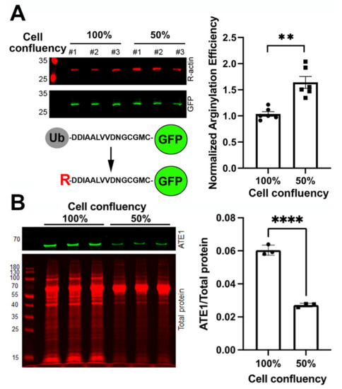For the arginylation sensor experiments, cells were transfected with the arginylation sensor plasmid 24–48 h prior to the experiment. For arginylation measurements in the confluent and semiconfluent cultures shown in Figure 1, cells transfected with the sensor were split after 24 h to achieve 50% and 100% confluency and incubated for a further 24 h in the culture. In Figure 2A, 48 h after transfection, 100 µg/mL cycloheximide and 40 µg/mL chloramphenicol were added to the culture media, followed by further incubation for 1 h. In Figure 3C, an equimolar mixture of arginylation sensor and RARS plasmids was transfected into the cells 48 h prior to harvesting.