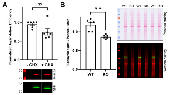 For the puromycylation assay, wild-type and Ate1−/− MEFs were treated with 10 µg/mL puromycin for 15 min at 37 °C. Cells were collected and lysed by sonication to measure the total protein concentration using the Pierce BCA Protein Assay Kit. Here, 16 µg total protein/lane of each sample was loaded for SDS-PAGE electrophoresis.