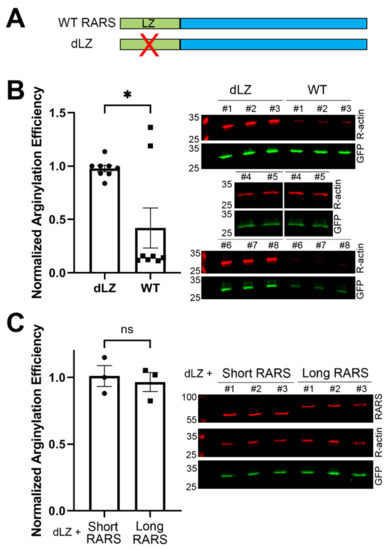 To test whether the redistribution of RARS between the soluble cytosolic (free) fraction and the fraction incorporated into the MSC affected arginylation, we used a previously produced cell line, in which the leucine zipper in the long RARS has been deleted, thus converting the entire RARS pool into the free (short) form [17]. In these cells, named dLZ for delta leucine zipper, RARS levels were similar to the control, but all of the RARS was represented by the short isoform that is unable to scaffold into the MSC complex (Figure 5A). Surprisingly, previous studies showed that this change does not affect translation [17]. However, the entire MSC is restricted from localizing into the nucleus, leading to the original conclusion by the authors of this study that RARS localization via the leucine zipper is required for the regulation of the alternative translation-independent nuclear functions of this enzyme [17].