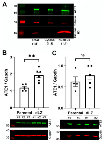 In dLZ cells, the only effect on RARS found in the previous study was independent of its enzymatic activity and its role in translation, but linked to its non-canonical role in facilitating the localization of MSC to the nucleus [17]. Two of the four ATE1 isoforms have been previously shown to exhibit partial, transient nuclear localization [11,30,31]. Making a parallel with the RARS, it is conceivable that deletion of the leucine zipper and the ensuing displacement of AARSs from the nucleus may also affect the nuclear:cytosolic balance of ATE1. To test this hypothesis, we compared the levels of ATE1 in the cytosol and nucleus (Figure 6A), as well as in the cytosolic fraction in dLZ cells and control cells (Figure 6B). Overall, ATE1 in the nucleus constituted only a minor fraction of the total ATE1, around eightfold less abundant than in the cytosol (Figure 6A) and very difficult to detect in routine experiments without adjusting the protein load. At the same time, the ATE1 cytosolic fraction was significantly increased in dLZ cells (Figure 6B), while the overall ATE1 level in these cells was not changed (Figure 6C). Thus, displacement of RARS from the MSC facilitates ATE1 redistribution into the cytosol. We speculate that this change likely leads to the increased arginylation in dLZ cells (Figure 6A), since the arginylation sensor we are using is expected to be cytosolic.