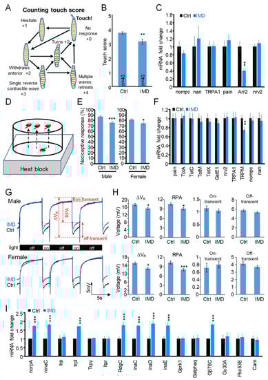 Liu, C.-H.; Chen, M.-Y.; Cheng, J.; Chuang, T.-N.; Liu, H.-P.; Lin, W.-Y. Imidacloprid Impairs Glutamatergic Synaptic Plasticity and Desensitizes Mechanosensitive, Nociceptive, and Photogenic Response of Drosophila melanogaster by Mediating Oxidative Stress, Which Could Be Rescued by Osthole. Int. J. Mol. Sci. 2022, 23, 10181. https://doi.org/10.3390/ijms231710181