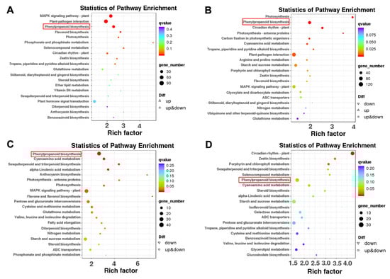 2.5. Identification of DEGs Involved in the Phenylpropanoid and Flavonoid Biosynthesis Pathways