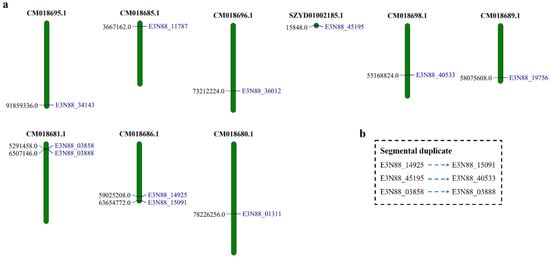 Chromosome localization showed that 9 of the 11 PIN genes of M. micrantha were distributed on different chromosomes, whereas (E3N88_14925, E3N88_15091) and (E3N88_03858, E3N88_03888) were distributed on the same chromosome: (CM018686.1) and (CM018681.1), respectively. Gene duplication is a major contributor to evolutionary momentum [], and plays a key role in the expansion of gene families. According to phylogenetic analysis, the M. micrantha PIN family shared three pairs of paralogue genes with high sequence similarity (>85%), two of which were on the same chromosome, indicating that a duplication had occurred. The three gene pairs (E3N88_14925, E3N88_15091), (E3N88_45195, E3N88_40533) and (E3N88_03858, E3N88_03888) belonged to segmental duplication according to amino acid sequence identity (Table S2) and distribution distance on chromosomes (Table 1, Figure 2).