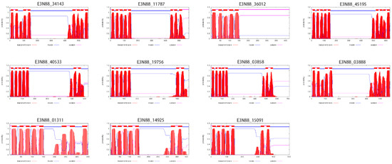 Transmembrane analysis of PIN proteins in M. micrantha. The red peaks represent the predicted transmembrane domain and blue color line indicate the central hydrophobic loop of proteins.