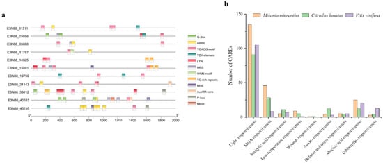 To further understand the potential regulatory mechanism of M. micrantha PIN genes and how they are regulated by phytohormones and defense and stress response elements, the PlantCare web server was used to search for possible cis-elements in the 2000 bp promoter region. A total of 12 common response-related CAREs were selected in the M. micrantha PIN gene family, including light, methyl jasmonate (MeJA), abscisic acid, auxin, salicylic acid, defense and stress response components (Figure 7a). Among the PIN gene family of M. micrantha, CAREs involving light, MeJA, abscisic acid, and low temperature responses were the most prevalent, and the number of these elements was significantly higher than for the other two vines (Citrullus lanatus and V. vinifera) (Figure 7b), indicating that for M. micrantha, as an invasive plant, its PIN response regulation to light, low temperature, MeJA, and abscisic acid might match its strong growth and environmental adaptability.