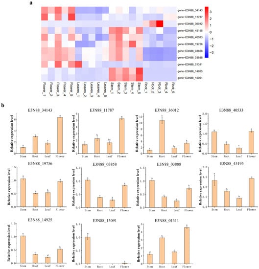 The expression pattern of PIN genes in different tissues (root, stem, leaf, flower) was detected via transcriptome data and a qRT-PCR experiment (Figure 8a,b). The RNA-seq results showed that E3N88_34143, E3N88_11787 and E3N88_01311 were only highly expressed in flowers, E3N88_36012 was only highly expressed in roots, and E3N88_14925 and E3N88_15091 were only highly expressed in stems (Figure 8a), which showed a tissue-specific expression pattern for these PIN genes. Seven of the M. micrantha PIN genes (E3N88_14925, E3N88_15091, E3N88_45195, E3N88_40533, E3N88_19756, E3N88_03858 and E3N88_03888) showed relatively high expression levels in stems (Figure 8a), suggesting that there was functional redundancy, which may be an important factor in the rapid growth of M. micrantha stems. To further verify the tissue expression results, all PIN genes were selected for qRT-PCR assay. The results showed that except for E3N88_01311, which also showed a high expression level in the root, the expression of other PIN genes was almost consistent with the transcriptome results (Figure 8b).