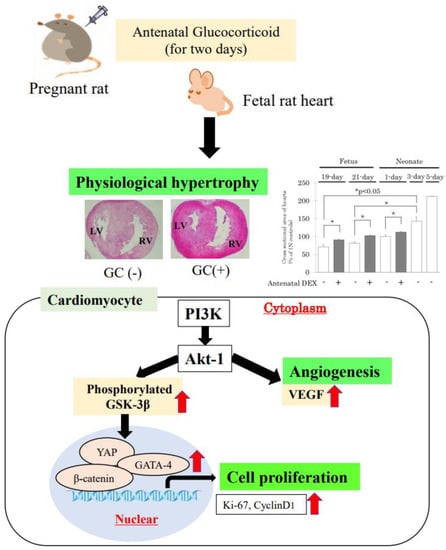 Signaling pathways connecting growth factors and their downstream mediators play a role in the development of physiological cardiac hypertrophy. The phosphatidylinositol-3 kinase (PI3K)–Akt pathway participates in the cardiac hypertrophic program based on heart growth [,]; our previous study describes the signaling pathway involved in cardiomyocyte proliferation in greater detail. Antenatal DEX administration has been shown to activate PI3K/phosphorylated glycogen synthase kinase-3β (p-GSK-3β)/β-catenin, which contributes to cardiac growth []. Specifically, as shown in Figure 1, GCs activate PI3K, and, subsequently, Akt-1 accelerates both p-GSK-3β and vascular endothelial growth factor (VEGF) expression []. Moreover, p-GSK-3β expression induced by Akt protein directly regulates downstream transcriptional factors, such as β-catenin and the zinc finger transcription factor, GATA-4 [,]. GATA-4 is related to cardiac myocyte hypertrophy [,]. An increase in GATA-4 induces an increase in myocardium contraction-related protein troponin T []. In addition, Akt-1-deficient mice show a decrease in endothelial cell density in the myocardium, attenuated expression of VEGF in the fetal heart, and reduced survival. Furthermore, p-GSK-3β protein, which is an important regulator of downstream substrates that are adjusted by Akt, is significantly increased with fetal DEX administration. β-Catenin and VEGF protein levels are also significantly increased. β-Catenin activation robustly enhances the proliferative capacity of early cardiomyocytes. VEGF is involved in regulating coronary angiogenesis during physiological cardiac hypertrophy [].