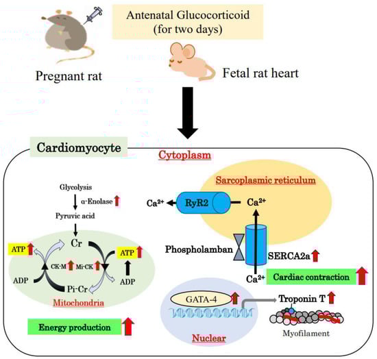 Antenatal GC administration increases the expression of SERCA2a and phospholamban protein in the fetal heart, resulting in the acceleration of Ca2+ cycling in the SR []. These processes may lead to the maturation of fetal cardiac function. A schematic diagram of energy production and cardiac contraction acceleration is shown in Figure 2. SERCA2a mRNA levels are lower in 19-day-old and 21-day-old fetal rat hearts than in 1-day-old neonates and adult rats. Additionally, SERCA2a protein levels tend to be lower in 19-day-old and 21-day-old fetal hearts than in neonatal and adult rats []. Antenatal DEX administration significantly increases SERCA2a production in the left ventricle (LV) and right ventricle (RV) of 19-day-old and 21-day-old fetal hearts []. Additionally, phospholamban protein levels in the heart are significantly increased in 19-day-old and 21-day-old fetuses treated with DEX. Phospholamban accumulation is observed in 1-day-old neonates. Antenatal DEX administration also increases phospholamban production in the RV and LV of 19-day-old and 21-day-old fetal hearts []. In contrast, antenatal GC administration does not affect the expression of type 2 ryanodine receptor, a Ca2+ transporter from the SR to the intercellular space [,]. The resulting increase in intracellular Ca2+ concentration has also been verified in cardiomyocytes treated with GC; the GC effect was mediated through cardiomyocyte GRs.