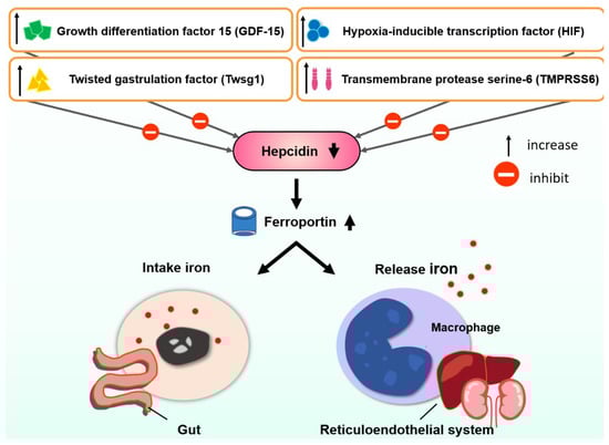 - Ganz, T.; Nemeth, E. Hepcidin and iron homeostasis. Biochim. Et Biophys. Acta 2012, 1823, 1434–1443. [Google Scholar] [CrossRef]