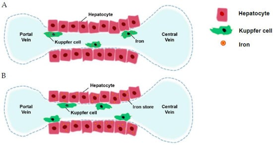Traditionally, iron is stored in the reticuloendothelial system (A), but in thalassemia intermedia, iron is stored in hepatocytes (B).