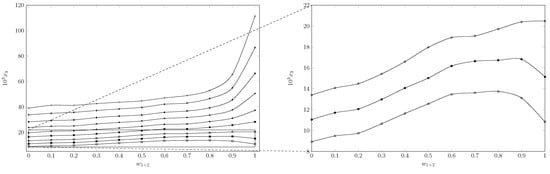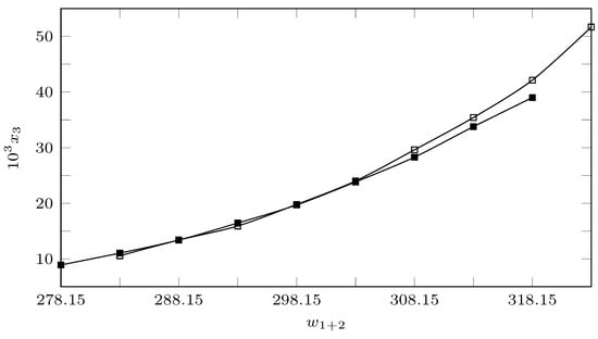 For the calculation of the Kirkwood–Buff integrals, the values of PEG 200 0.42 [] and water 0.457 [] were taken, was taken as 108.69 cm/mol [], and and were calculated from the density data reported by Muñoz et al. [] according to Equations (20) and (22).