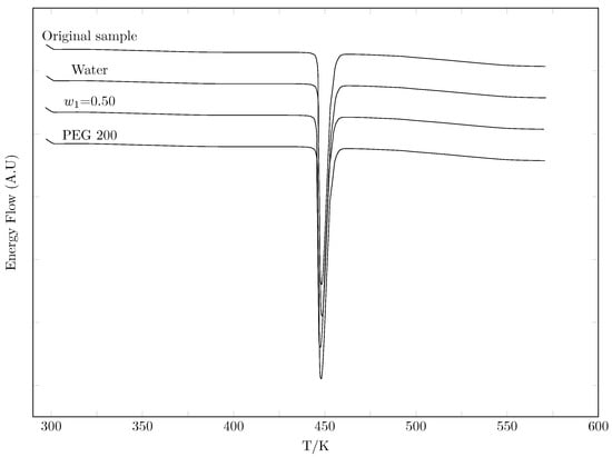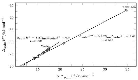 In this context, from pure water to , the process was driven by enthalpy according to Figure 11 (positive slope), which was corroborated by Figure 12 (slope > 1.0), and from to PEG 200, the solution process was driven by entropy (Figure 11, negative slope; Figure 12 slope < 1.0).
