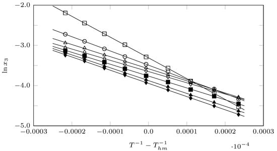 van ’t Hoff plot, for isoniazid (3) in (PEG 200 (1) + water (2)) cosolvent mixtures at some cosolvent mixtures, ♦: ; ▲: ; ■: ; ⋄: ; △: ; ∘: ; □: .