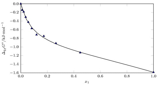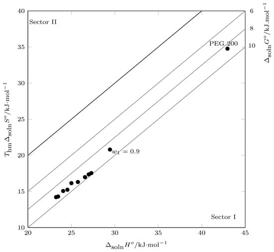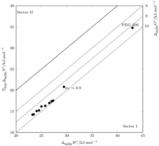 Analyzing the process using Perlovich’s graphic method [,] (Figure 9) from ( MPa []) to ( MPa), the data were recorded in sector V ( and ) and from ( MPa) to pure PEG 200, the data were recorded in sector I (), indicating that in all cases the transfer process was driven by the transfer enthalpy.
