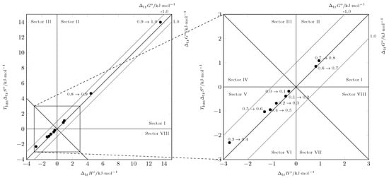The enthalpy–entropy compensation analysis can be performed by plotting vs. , where positive slopes indicate enthalpy conduction and negative slopes indicate entropic conduction [,], or plotting vs. , where slopes greater than 1.0 indicate enthalpy conduction and slopes less than 1.0 indicate entropic conduction [].