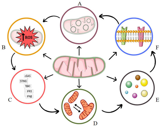Mitochondrial pathways in the immune response. A: Mitochondrial DNA. B: ROS accumulation. C: cGAS-STING.D: Mitochondrial dynamics. E: Inflammassomes. F: TLR receptors.