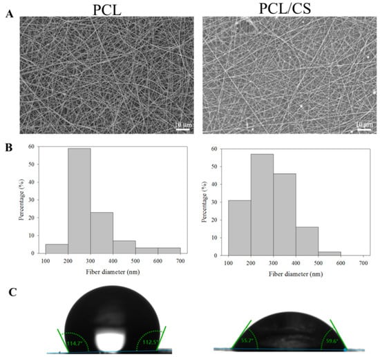 The scanning electron microcopy (SEM) micrograph ((A), bar = 10 μm), fiber diameter distribution (B), and water contact angle (C) of PCL and PCL/CS nanofiber membranes.