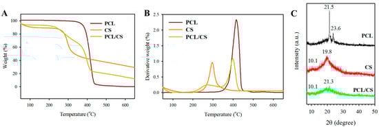 The thermogravimetric analysis (TGA) (A), derivative thermogravimetric analysis (DTA) (B) and X-ray diffraction (XRD) analysis (C) of PCL and PCL/CS nanofiber membranes. The CS polymer is used for comparison.