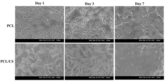 The scanning electron microcopy (SEM) images of cell-seeded PCL and PCL/CS nanofiber membranes after being cultured for 1, 3 and 7 days. Bar = 100 μm.