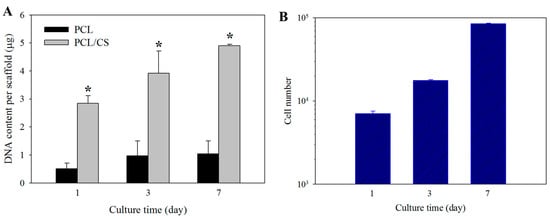 In order to determine cell proliferation, the cell number in PCL and PCL/CS was compared based on the DNA content per membrane scaffold (Figure 5A). The mesothelial cells steadily proliferated from day 1 to 7, with significantly higher DNA content in PCL/CS than in PCL at all time points. The difference in cell seeding efficiency between the membranes was determined from the DNA content on day 1, with PCL/CS showing 5.7 ± 0.5 folds of DNA contents compared with PCL. On days 3 and 7, the DNA contents of PCL/CS were 4.1 ± 1.3 and 4.7 ± 0.5 folds compared with PCL, respectively. For comparison, the cell proliferation rate when mesothelial cells are cultured on a petri dish is shown in Figure 5B.