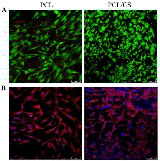 The confocal microscopy observation of mesothelial cells cultured in PCL and PCL/CS nanofiber membranes by live/dead ((A), bar = 75 μm) and nucleus/cytoskeleton staining ((B), bar = 75 μm). The live cells were stained green by calcein AM, and dead cells were stained red by ethidium homodimer-1 in (A). The actin cytoskeleton was stained red by phalloidin-rhodamine, and the cell nucleus was stained blue by Hoechst 33258 in (B).