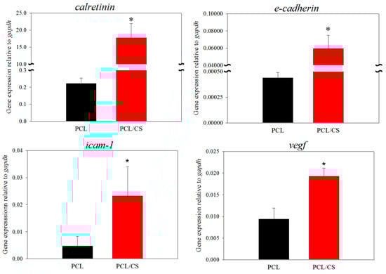 The relative gene expression level of calretinin, E-cadherin, intercellular adhesion molecule (ICAM-1) and vascular endothelial factor (VEGF) by mesothelial cells was determined by quantitative real-time polymerase chain reaction (qRT-PCR) after culture for 7 days in PCL and PCL/CS nanofiber membranes. Glyceraldehyde 3-phosphate dehydrogenase (GAPDH) was used for the quantification. * p < 0.05 compared with PCL.