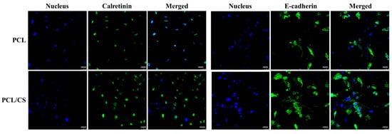 The immunofluorescence (IF) staining of calretinin and E-cadherin produced by mesothelial cells cultured in PCL and PCL/CS nanofiber membranes for 7 days. The proteins were stained green using a fluorescein (FITC)-conjugated secondary antibody that can bind with the primary antibody against calretinin or E-cadherin. The nuclei were stained blue by Hoechst 33258. Bar = 25 μm.