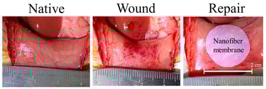 A wound was created on the native parietal peritoneum after abrading, followed by repair with a 2-cm PCL/CS nanofiber membrane, with or without mesothelial cells.