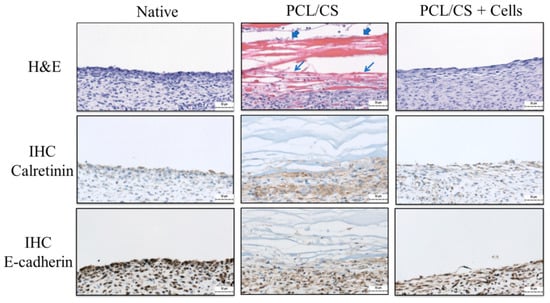 The hematoxylin and eosin (H&E) and immunohistochemical (IHC) staining of calretinin and E-cadherin of the mesothelium tissue 7 days post-implantation (bar = 50 μm). The abraded parietal peritoneum was repaired with PCL/CS or PCL/CS + cells as the acellular and the cellular groups, respectively. The PCL/CS + cells sample is prepared by culturing mesothelial cells in PCL/CS membrane scaffold for 7 days in vitro before implantation. The native mesothelium is used for comparison on the left. The arrowheads indicate residual membrane filaments, and arrows indicate the inflammatory cell layer in PCL/CS.