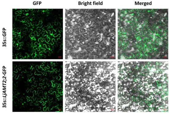 Recombinant plasmid LjAMT2;2-GFP and the control vector were separately introduced into Agrobacterium tumefaciens strain GV3101, which was then injected into Nicotiana benthamiana leaves (at 5–6 weeks old). After injection, leaves were cultured in darkness for 48 h, and green fluorescent protein (GFP) fluorescence was observed using a laser confocal microscope (Leica LSM800, Weztlar, Germany) at 488 nm excitation.