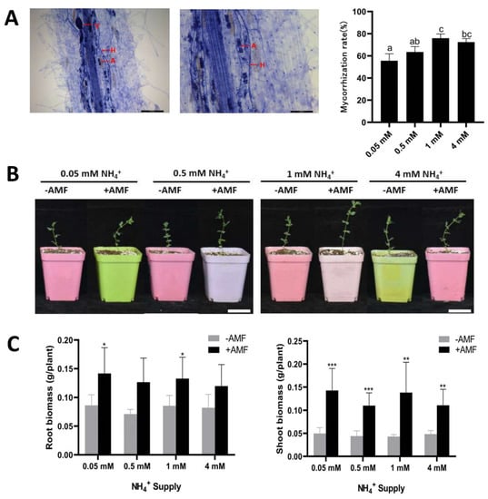 We explored the effects of AMF colonisation on the growth of Lotus japonicus under different ammonium ion concentrations. The results showed that the symbiosis rate between roots and AMF reached more than 50%, and the mycorrhizal colonisation rate increased with increasing ammonium ion concentration. When the concentration was 1 mM, the mycorrhizal colonization rate was highest (Figure 4A), and most roots achieved symbiosis. Subsequently, we assessed aboveground and underground parts of roots under different treatments (Figure 4B,C). The results showed that the aboveground and underground biomasses of roots with AMF were significantly higher than without AMF. Thus, under nitrogen starvation conditions, the dominant role of AMF was more significant.