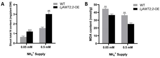 Comparison of physiological indices between LjAMT2;2-OE and wild-type plants. (A) Total nitrogen content. (B) MDA content. Data are means ± standard error (SE; n ≥ 3 biological replicates; ** p ≤ 0.01, *** p ≤ 0.001).