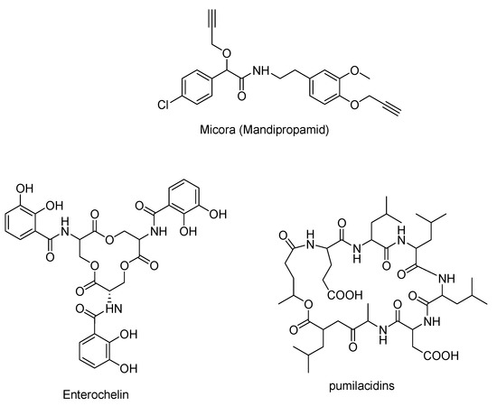 The Passerini reaction has also been utilized to synthesize a variety of valuable structural motifs, including cyclic lipopeptides, which are antibacterial natural products with a broad spectrum of biological activities [11]. In just two steps, the Passerini reaction also yields the fungicidal compound mandipropamid, which is formed by the reaction of an in situ-synthesized isocyanide, an aldehyde, and a carboxylic acid (Figure 1). Micora (mandipropamid) is obtained by alkylation with propargyl bromide in the second step [11,12].
