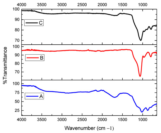 The FT-IR spectrum of the catalyst is shown in Figure 2. The catalyst was solid, and the solid-state IR spectrum was obtained by the attenuated total reflection (ATR) method. For each experiment, 16 scans were performed in the frequency range from 650 to 4000 cm−1. The wide bands detected in the spectra (A) at 3511 and (C) 3486 cm−1 were attributed to superimposed stretching modes of Si–OH groups and hydroxyl groups (O–H). The peaks from Si–O–Si groups, which occur in the range of 1250–1000 cm−1 for antisymmetric stretching, are a characteristic indicator of the silica structure. For silica (B, SiO2) without a catalyst, the major peaks were broad antisymmetric Si–O–Si stretching from 1200 to 1000 cm−1 and symmetric Si–O–Si stretching near 800 cm−1.