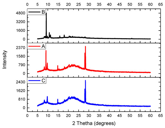 As shown in Figure 3, the XRD pattern of (A) the immobilized sulfuric acid on silica gel displayed a noticeable signal at a 2θ angle of 22.91° (a broad diffraction band), which is reminiscent of a typical amorphous silica diffraction pattern. The same broad diffraction band was noticed for the recovered catalyst (C) after five cycles (Figure 3C). A certain conclusion can be made about the crystalline structure of the support, i.e., silica was not distorted during the preparation of the catalysts.