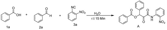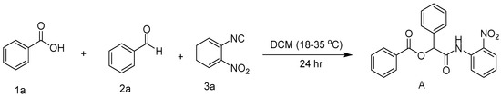 Multicomponent reactions have been characterized as efficient methods for synthesizing polyfunctional compounds with high diversity and complexity in a few steps. The reaction of benzoic acid (1a), benzaldehyde (2a), and 2-nitrophenylisocyanide (3a) was chosen as the model reaction, and they were subjected to a typical Passerini reaction in DCM at room temperature (18–35 °C) for 24 h (Table 1, entry 5). The desired product (A) was obtained in 85% yield.