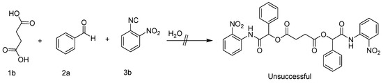 The Passerini reaction under the above optimized condition did not afford the expected bis α-acyloxycarboxamide derivatives in the case of phthalic acid (1b) with 2a and 3a. This may be attributed to the planarity of the phenyl ring preventing the second Passerini reaction due to steric hindrance. According to a literature review, succinic acid could be used to synthesize bis α-acyloxycarboxamides [28]. The free rotation of the C-C bond between the two methylene groups was suggested as a strategy to increase the flexibility and avoid steric restriction around the -COOH. However, the synthesis of bis α-acyloxycarboxamides utilizing succinic acid (1c) under the above experimental condition was unsuccessful; all trials led to the hydrolysis of the corresponding isocyanide (Scheme 4).
