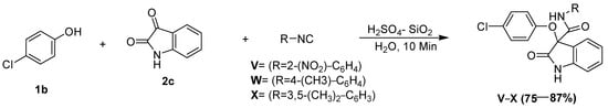 The synthetic potential of this protocol was examined by utilizing electron-deficient phenols as the acid component in the reaction. Thus, the Passerini reaction involving isatins (2c) with 4-chlorophenol (1b) and 2-nitrophenylisocyanide (3a) under optimized reaction conditions resulted in the synthesis of an O-arylated oxindole derivative in good to excellent yields (Scheme 5). In this reaction, the irreversible Smiles rearrangement of the intermediate phenoxyimidate adducts resulted in the formation of the O-arylated product, and this is an example of the application of the Smiles rearrangement in a Passerini reaction.