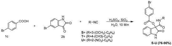 Scheme 7 illustrates the proposed mechanism for the formation of α-acyloxycarboxamide derivatives in the presence of SiO2-H2SO4. The catalyst first activates the carbonyl group of the aldehydes (4). Then, the isocyanide attacks the activated carbonyl (5) group nucleophilically, forming an intermediate known as nitrilium (6). The intermediate (6) is then attacked by the carboxylate of (7), which is followed by an acyl transfer by a Mumm rearrangement to generate derivatives of oxindole-based acyloxycarboxamides (9).