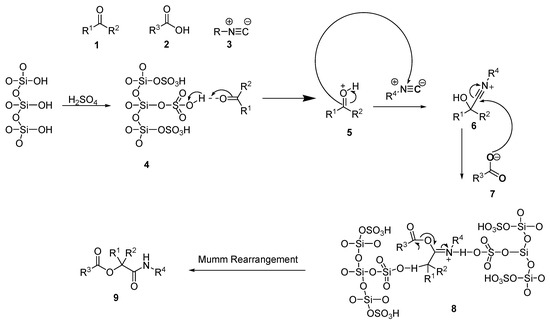 Proposed mechanism for the formation of α-acyloxycarboxamides in the presence of the immobilized sulfuric acid on silica gel (SiO2-H2SO4).