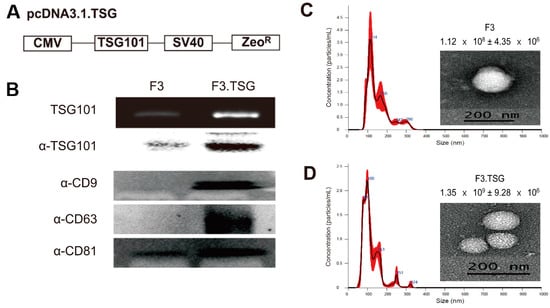 Establishment of F3.TSG. (A) Construct of pcDNA3.1_TSG. (B) Expression of exosome marker (TSG101, CD9, CD63 and CD81) in F3 and F3.TSG by RT-PCR and western blotting. (C,D) Number of exosomes by nanoparticle tracking analysis in F3 (C) and F3.TSG cells (D). All samples were analyzed in triplicate.