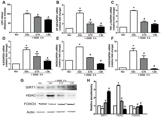 Neuroprotective and anti-inflammatory effects of exosomes in N2A cells subjected to oxygen–glucose deprivation (OGD). (A) Neuroprotective effects of exosomes under 3 h OGD exposure in the lactate dehydrogenase (LDH) assay; (B–F) real-time PCR analysis of mRNA of nuclear factor (NF)-κB (B), tumor necrosis factor (TNF)-α (C), interleukin (IL)-6 (D), inducible nitric oxide synthase (iNOS) (E), and cyclooxygenase 2 (COX2) (F) normalized to glyceraldehyde-3-phosphate dehydrogenase (GAPDH); (G,H) Western blot analysis of sirutin 1 (SIRT1), histone deacetylase (HDAC), and forkhead box O-3 (FOXO3) showing representative bands (G) and band densities normalized to actin (H). Densitometric analysis of the Western blot was performed using ImageJ. n = 3 per treatment group. * Significantly different from normal control (p < 0.05). # Significantly different from vehicle control (p < 0.05).