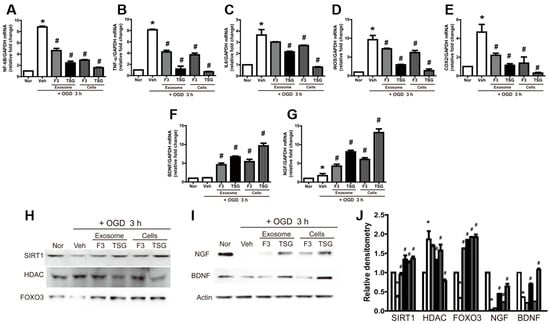 A Western blot analysis showed that SIRT1 and FOXO3 levels were decreased and HDAC levels were increased by OGD and reoxygenation (Figure 3H). However, the OGD-induced abnormal production of the proteins was markedly attenuated by coculture with F3 and F3.TSG cells, although there were differences in sensitivity. In addition, BDNF and NGF protein levels were decreased by OGD and reoxygenation, and this downregulation of the proteins was markedly reversed by coculture with F3 and F3.TSG cells (Figure 3I).