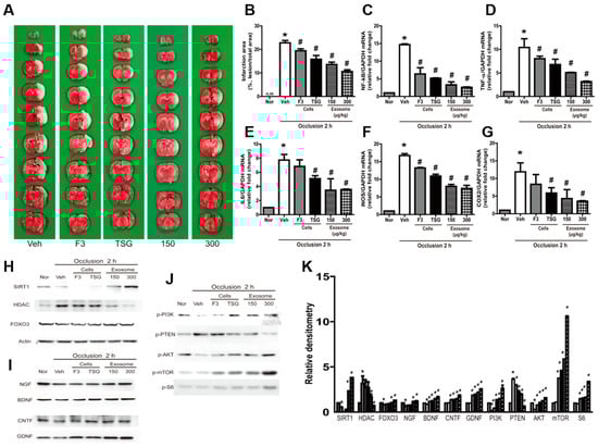 Neuroprotective effects of exosomes in middle cerebral artery occlusion (MCAO) animals. (A) Brain infarction volume in stroke-challenged rats treated with F3 cells, F3.TSG cells, or exosomes (0.5 or 1.0 mL/kg). Representative images of brain sections stained with 2% 2,3,5-triphenyltetrazolium chloride; (B) total infarction volumes were summed up from all slices; (C–G) real-time PCR analysis of mRNA of nuclear factor (NF)-κB (C), tumor necrosis factor α (TNF-α) (D), interleukin 6 (IL-6) (E), inducible nitric oxide synthase (iNOS) (F), and cyclooxygenase 2 (COX2) (G) normalized to glyceraldehyde-3-phosphate dehydrogenase (GAPDH); (H–K) Western blot analysis of the following growth/trophic factor proteins: sirtuin 1 (SIRT1), histone deacetylase (HDAC), and forkhead box O-3 (FOXO3) for DNA damage (H), nerve growth factor (NGF), brain-derived neurotrophic factor (BDNF), ciliary neurotrophic factor (CNTF), and glial-cell-derived neurotrophic factor (GDNF) (I); representative bands of the following proliferation-related proteins phosphatidyl inositol-3-phosphate kinase (PI3K), phosphatase and tensin homolog (PTEN), protein kinase B (AKT), mammalian target of rapamycin (mTOR), and S6 (J); the band densities normalized to actin (K). n = 3 per treatment group. * Significantly different from normal control (p < 0.05). # Significantly different from vehicle control (p < 0.05).