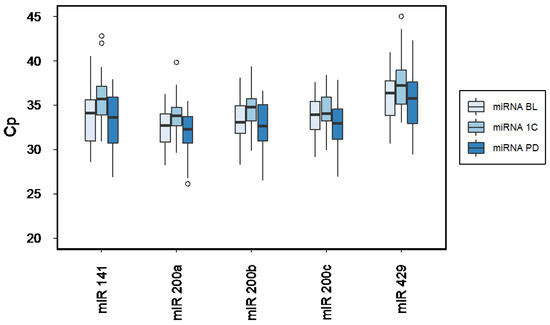 Figure 1 illustrates expression levels of circulating miR-200a, miR-200b, miR-200c, miR-141, and miR-429 at BL, 1C and PD. Cp-values and miRNA expression are to be read inversely, meaning a higher Cp value corresponds to lower miRNA expression, and conversely. Mean detection rates of the measured miRNA panel are listed in the supplementary material (Supplementary Material, Table S2).