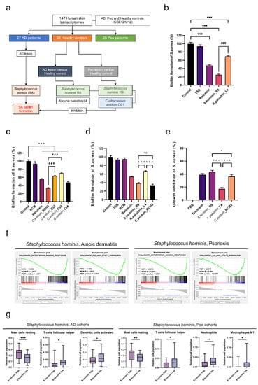Potential therapeutic microbiomes are capable of inhibiting Staphylococcus aureus (SA)-derived biofilms that may initiate atopic dermatitis (AD) and psoriasis (Pso) pathogenesis. (a) Schematic of GSE121212 transcriptome analysis and skin microbiome isolation. (b) Evaluation of S. hominis R9 and K. palustris L4 to inhibit SA biofilm formation. *** p < 0.001 compared to control group. (c) Evaluation of SA biofilm formation inhibition ability by C. avidum strains. *** p < 0.001 compared to control group. ### p < 0.001 compared to C. avidum R-CH3 group. (d) Comparing inhibition of SA biofilm formation by S. hominis (r9), C. avidum (R-CH3), and K. palustris (l4). *** p < 0.001 compared to K. palustris L4 group; ns, non-significant. (e) Evaluation of SA growth inhibition ability of S. hominis (r9), C. avidum (R-CH3), and K. palustris (l4). *** p < 0.001 compared to K. palustris L4 group; # p < 0.05 between S. hominis R9 and C. avidum R-CH3 groups. (f) Gene set enrichment analysis (GSEA) stratified by S. hominis abundance in AD and Pso cohorts (nominal [NOM] p < 0.001; interferon gamma [IFN-γ] response, [NOM] p < 0.001; IL6-JAK-STAT3 signaling in AD cohort, [NOM] p < 0.001; IFN-γ response, [NOM] p < 0.001; IL6-JAK-STAT3 signaling in Pso cohort). (g) Boxplots comparing macrophages (M1), resting mast cells, follicular T helper cells, dendritic cells, and neutrophils stratified by an abundance of S. hominis in AD and Pso. * p < 0.05, ** p < 0.01, *** p < 0.001 comparing S. hominis high versus low group. Statistical significance was calculated using Bonferroni tests. CIBERSORT algorithm was used for the Cancer Genome Atlas (TCGA) data of AD and Pso cohorts.