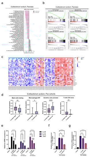 GSEA was performed in the Pso cohort to investigate the DEG-related signaling pathways and to determine if immune responses are similar between S. hominis and C. avidum enrichment levels. GSEA showed that the C. avidum low group had inflammatory responses comparable to the S. hominis low group, as well as increased INF-α response, INF-γ response, TNF-α signaling via NF-κb signaling, and IL6-JAK-STAT3 signaling (Figure 2a). Even in the C. avidum low group, the IFN-γ response set (NES = −2.619, NOM p < 0.001 and FDR q-value < 0.001), TNF-α signaling via NF-κb signaling (NES = −2.059, NOM p < 0.001 and FDR q-value < 0.001), IL6-JAK-STAT3 signaling (NES = −2.235, NOM p < 0.001 and FDR q-value < 0.001), and inflammatory response (NES = −2.148, NOM p < 0.001 and FDR q-value < 0.001) were consistent with those seen in the S. hominis low group in AD as well as Pso (Figure 2b). Furthermore, the heatmap of the Pso cohort also showed that immune-related genes, including those involved in IL6-JAK-STAT3 signaling, INF-γ signaling, and TNF-α signaling, were expressed at higher levels in the C. avidum low group than in the C. avidum high group (Figure 2c).