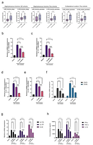 In addition, IL-13 promotes the development of atopic inflammation via IL-4R𝛂/IL-13R𝛂1 and contributes to the activation of STAT6/STAT3 by activating downstream JAK1/TYK2/JAK2 []. Together with IL-4, IL-13 can induce Th2-biased T cell differentiation, IgE production in B cells, and Th2-associated chemokines, such as CCL17 and CCL22 in dendritic cells (DCs) []. In response to SA, the expression of IL-13 significantly increased, while the expression of IL-13 with S. hominis R9 and C. avidum R-CH3 treatment significantly decreased. On the other hand, it was observed that treatment with C. avidum R-CH3 significantly reduced the expression of SA-derived IL-13 to a greater extent than S. Hominis R9 treatment (Figure 3c). Furthermore, both S. Hominis R9 and C. Avidum R-CH3 significantly reduced the production of SA-derived IL-6. Interestingly, we also observed that C. Avidum R-CH3 significantly reduced SA-induced expression of IL-6 to a greater extent compared to S. hominis R9 (Figure 3d). Therefore, not only did SA significantly enhance the expression of IL-24, and both S. hominis R9 and C. avidum R-CH3 significantly reduced the expression of SA-derived IL-24, but C. avidum R-CH3 was once again shown to significantly reduce IL-24 expression to a greater extent than S. hominis R9 (Figure 3e). Furthermore, it was shown that STAT3 and STAT6 significantly increased in SA-treated AD and Pso groups. It was established that S. hominis and C. avidum contributed to the effective reduction of STAT3/STAT6. For both STAT3 and STAT6, C. avidum R-CH3 showed a significantly greater decrease compared to the SA-only treated group and the S. hominis R9 treated group (Figure 3f).